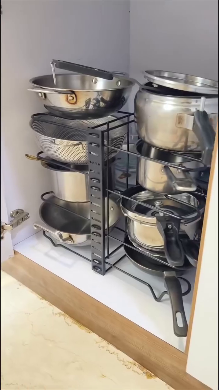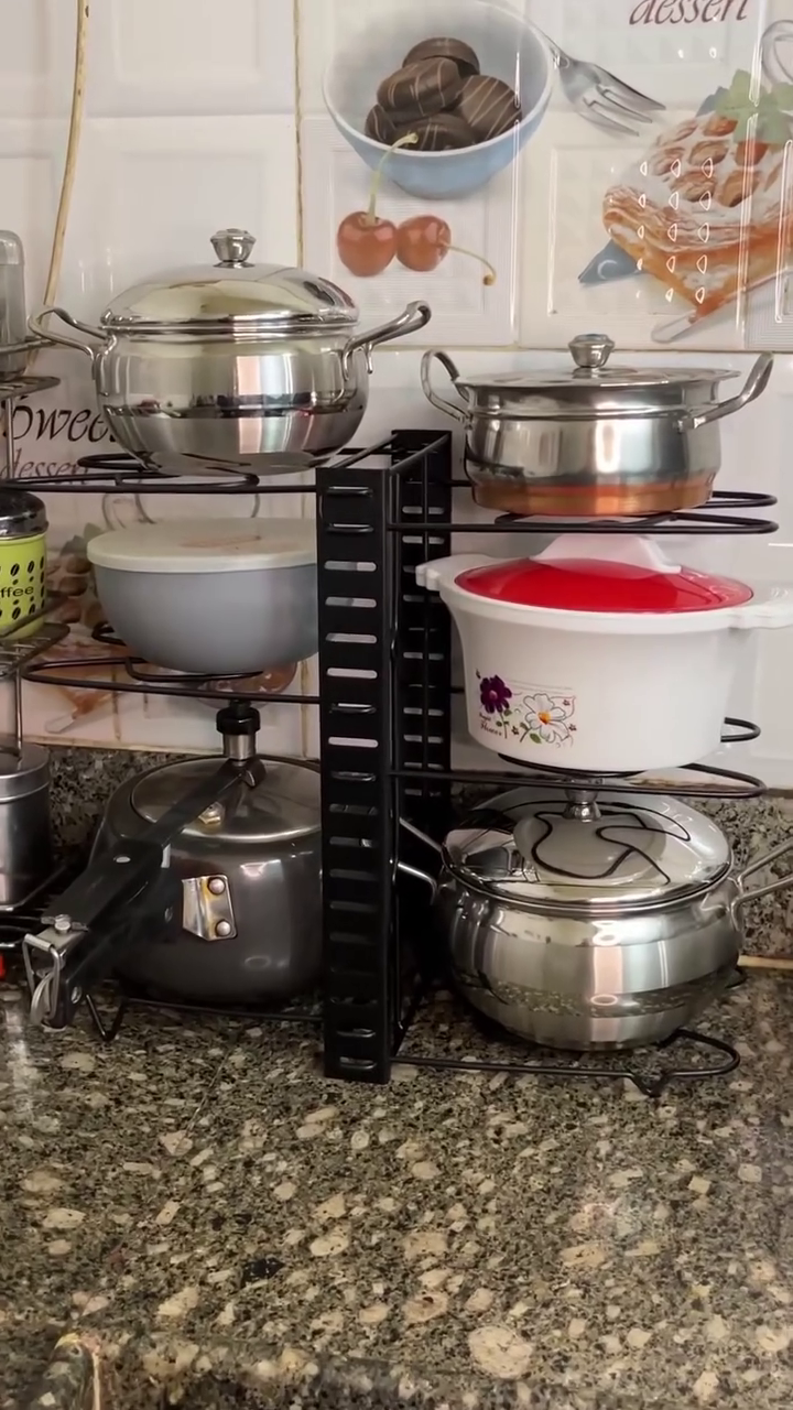 Space-saving adjustable kitchen storage rack designed to organize pots, pans, and cookware efficiently. Multi-tier design maximizes countertop space while keeping your kitchen neat, accessible, and clutter-free.