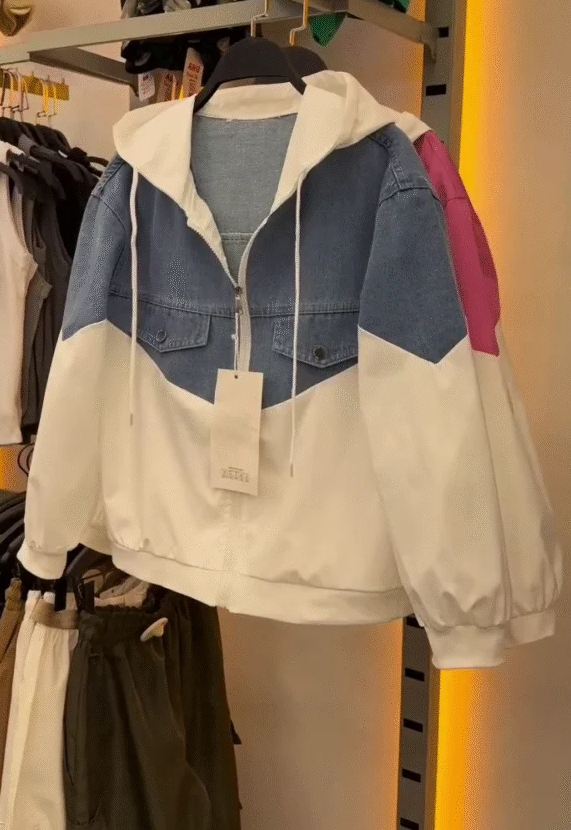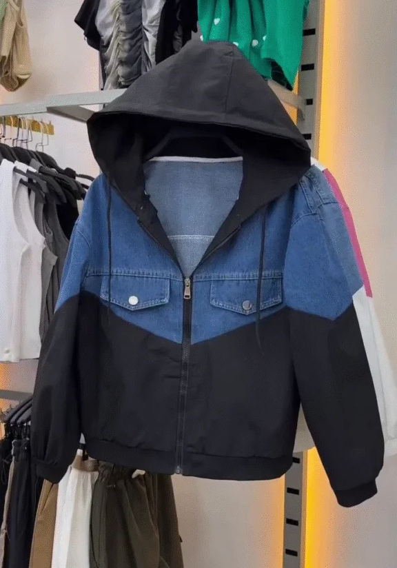 A stylish hooded jacket featuring a color-block design with denim blue panels on the upper section and black fabric on the sleeves and lower half. The jacket includes a full front zipper, flap chest pockets, and a relaxed fit. It is displayed on a hanger in a clothing store, surrounded by various garments.