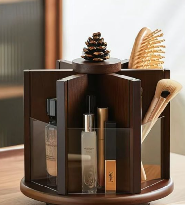 Organize your beauty essentials in style with this 360° rotating wooden makeup organizer. Crafted from durable wood with transparent side panels, this elegant storage stand offers multiple compartments for neatly arranging perfumes, makeup brushes, lipsticks, skincare products, and other cosmetics.