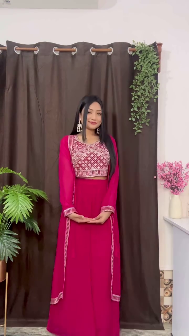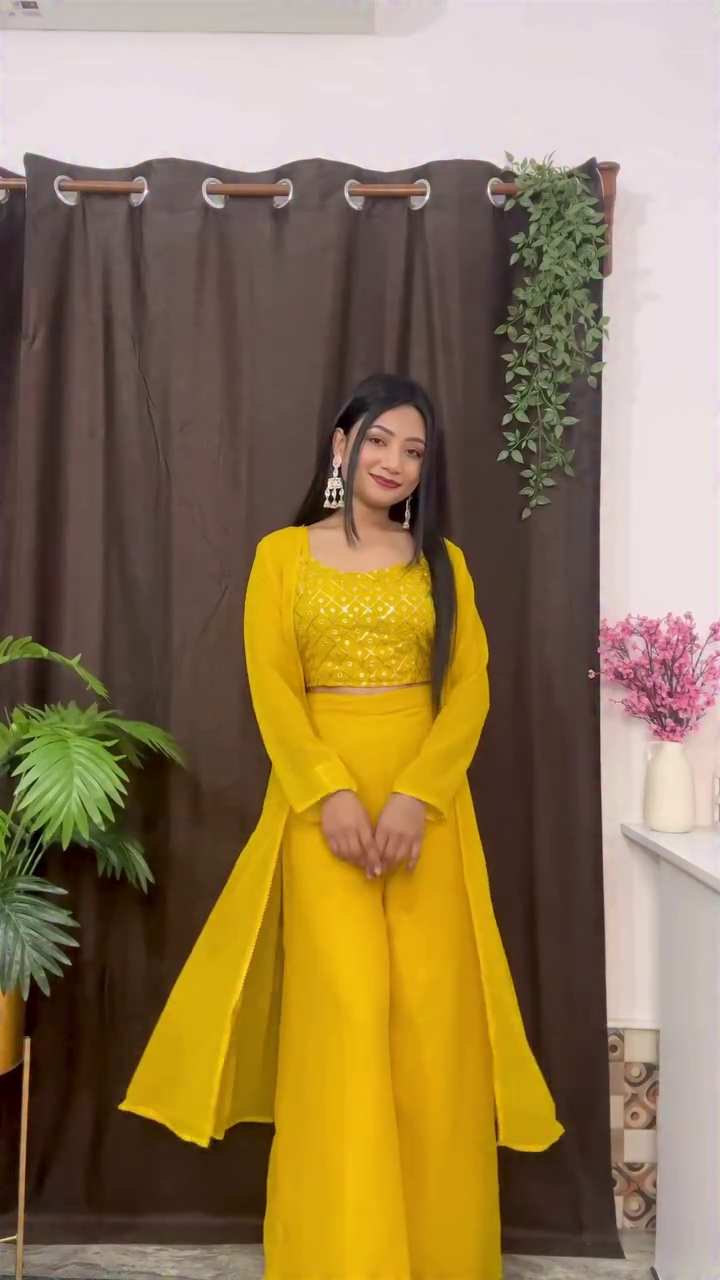 Make a bold and beautiful statement with this radiant mustard yellow three-piece ethnic set, designed to bring effortless grace and contemporary charm to your wardrobe. This stunning ensemble features a delicately embroidered crop top adorned with intricate mirror-inspired detailing, perfectly paired with flowy high-waisted palazzo pants for a flattering silhouette.