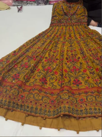 This is a beautifully crafted mustard yellow Anarkali dress featuring rich, intricate embroidery throughout. The garment is adorned with vibrant floral patterns in shades of red, pink, and green, giving it a traditional and festive appeal. The bodice is detailed and structured, while the skirt flares out gracefully with densely embroidered motifs near the hemline. The fine threadwork, decorative borders, and overall color combination make this outfit perfect for weddings, festive celebrations, and cultural events.