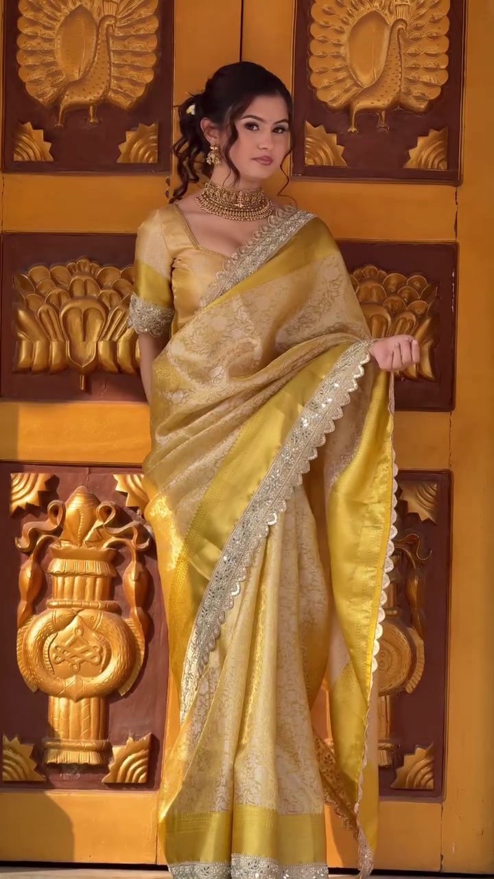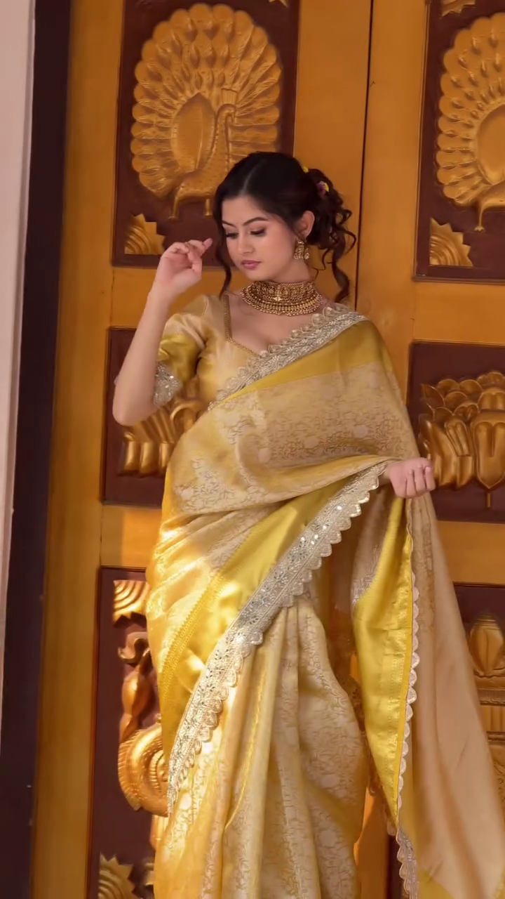 Perfect for women who appreciate classic fashion with a royal touch, this golden silk saree enhances your style with elegance and grace. Add this stunning piece to your collection and experience the charm of traditional Indian attire designed for modern celebrations.