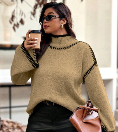 Women’s Camel High-Neck Sweater with Contrast Stitching